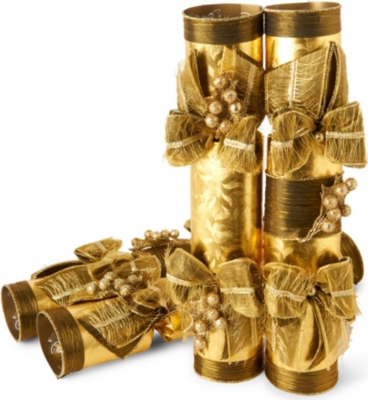 These gold leaf detail Christmas crackers are perfect for adding a touch of glamour to festive spreads. A box of six crackers, handmade with ribbon detail ends and gold berry detail bow trims, they are the ultimate in luxury table decoration. Filled with luxury gifts including, Swarovski crystal keyring, silver fortune cookie, leather card holder and more.
