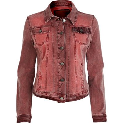 Red faded embroidered pocket denim jacket
