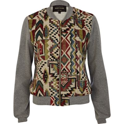 Grey aztec embroidered bomber jacket