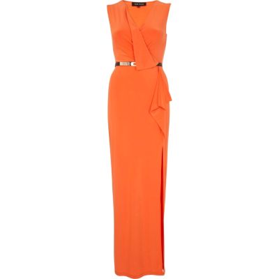 Orange wrap front belted maxi dress