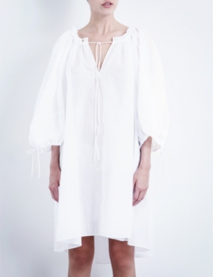 Dress made of a delicate linen blend. Features a midi silhouette with bows on the shoulders, V-neck in front and back and invisible zip fastening in the back