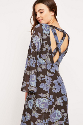 Sheer maxi dress from American alternative label Free People features cropped bell sleeves and a long, ankle length silhouette. Topped with an all-over floral print and finished with a criss-cross strap detail at the back.