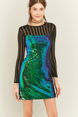 Free your inner mermaid in this green sequin mini dress from UO's own Sparkle & Fade label. Ultra-shiny holographic sequin outer in a body-skimming mini cami dress construction. Topped with thin, adjustable shoulder straps and a square neckline front to back.